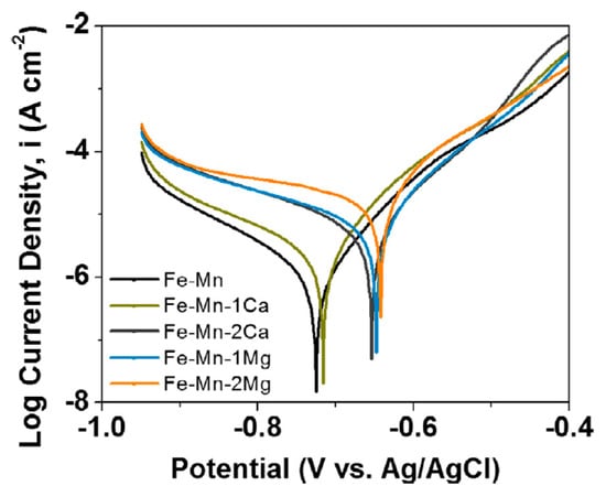 Potentiodynamic polarization of sintered Fe-Mn, Fe-Mn-Ca and Fe-Mn-Mg (Reprinted with permission from Ref. [32]. Copyright @ 2016, Elsevier).