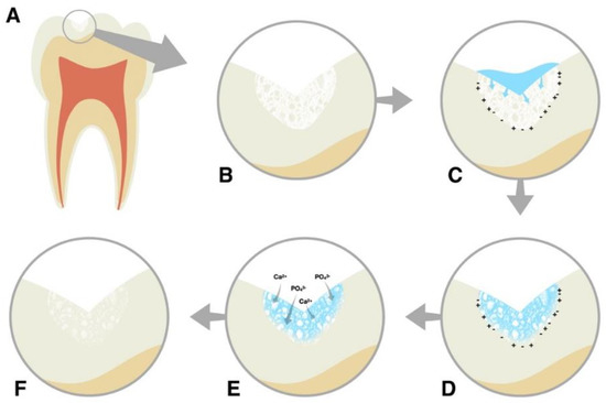Mechanism of action of P11-4. (A,B) Initial caries lesion characterized by demineralized and porous enamel (white spot lesion). (C) The monomeric solution of P11-4 on the initial caries lesion surface diffuses through the pores of demineralized enamel. (D) Triggered by local pH on the enamel surface, P11-4 undergoes self-assembly by β-sheet formation; thus, a 3D matrix is formed in the lesion. (E) A 3D matrix with a high affinity for Ca2+ and PO43− and nucleation of minerals forms until maturation in HAP-like crystals (de novo mineralization). (F) Biomimetic mineralized enamel.