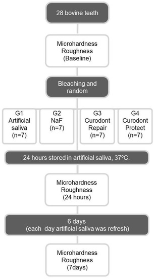 The C- group was stored in artificial saliva immediately after bleaching. For the NaF group, 2% NaF was left for 1 min on the enamel surface. After that, excess was removed with absorbent paper, and 50 µL of Ca2+ and PO4 supersaturated solution was applied for 1 min. Excess was removed with gauze, surfaces were rinsed with deionized water for 10 s, and the specimens were stored in artificial saliva (1.5 mM CaCl2, 0.9 mM KH2PO4, 130 mM KCl, and 20 mM Hepes, pH 6.5) [31] for 1 or 7 days. For the Repair group, Curodont™ Repair was mixed with 50 µL of distilled water, applied on the enamel surfaces, and left undisturbed for 5 min. After that, excess was removed with absorbing paper, and 50 µL of Ca2+ and PO4 supersaturated solution was applied for 1 min. Excess was removed with gauze, and the specimens were stored in artificial saliva for 1 or 7 days. For the Protect group, Curodont™ Protect was applied on the enamel surfaces and left to react for 5 min. Excess was removed with absorbing paper, and 50 µL of Ca2+ and PO4 supersaturated solution was applied for 1 min. After that, excess was removed, and specimens were stored as preciously described for the Repair group. The specimens from all groups were immersed in artificial saliva at 37 °C and tested for Knoop microhardness and surface roughness after 1 and 7 days.