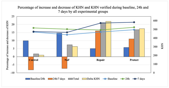 Analysis of microhardness (Knoop hardness—KHN) of the bovine enamel subjected to bleaching and treated with each material over time. Bars represent the percentage increases and decreases in KHN and KHN verified at baseline and at 24 h and 7 days after treatment for all experimental groups. Gray bars represent microhardness gain after the time allowed to elapse for each treatment. Yellow bars represent the percentages of variations considering initial and final KHN values measured at different times according to each material. Rows show KHN raw values for each group. Blue row—KHN at baseline; green row—KHN at 24 h; dark-blue row—KHN at 7 days.