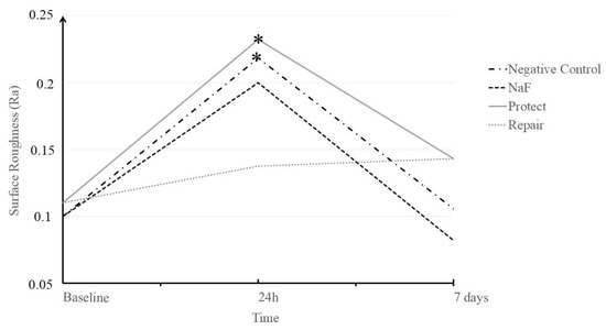 Surface roughness (Ra) values are presented in Table 4 and Figure 5. There was no interaction between study factors (p = 0.097). Overall, there was a difference between the evaluation times. Values for the baseline (p = 0.000) were significantly lower than those at 24 h (p = 0.000), which were significantly higher than those at 7 days (p = 0.031). To verify the recovery Ra for all treated groups, a Dunnett’s test was performed (p < 0.05). The results showed a significant increase in Ra when compared to the negative control (p = 0.000) and Protect (p = 0.019) groups, which means that the roughness of the enamel surfaces was significantly higher than those of the baseline. The Repair group maintained surface roughness at both times. After 7 days in saliva solution, all groups recovered the original Ra, similar to sound teeth.