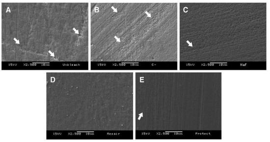 SEM (operated at 15 kV, with a WD of 10 mm, a spot size of 25, and a magnification of 2500×) micrographs of the surface specimens from each group. (A) Micrograph of the unbleached bovine enamel specimen. White arrows indicate slight rugosity and enamel pores. (B) Micrograph of the bleached, untreated negative control (C-) enamel specimen. White arrows indicate some depressions in or dissolution of the enamel surface. (C) Micrograph of the specimen surface-treated with NaF. White arrow indicates subtle irregularities and slight parallel grooves. (D) Micrograph of the specimen surface-treated with Curodont™ Repair. (E) Micrograph of the specimen surface-treated with Curodont™ Protect. The enamel surface seems smoother and the defects caused by bleaching were less evident (D,E). The white arrow (E) shows parallel lines on the surface resulting from polishing.