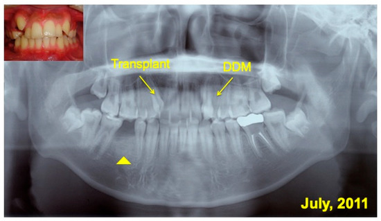 Collagen derived from cow or pig has been a commercially available organic material for medical use since the 1970s in Japan [18,19]. Autogenous pDDM is a composite of growth factors, inorganic and organic, with the original cross-links and has a natural structure [10]. As advantages, DDM possess the ability to coagulate platelet-free heparinized, citrated, and oxalated blood plasmas, and clotting constituents become denatured in contact with the insoluble coagulant proteins [20]. The coagulation action of blood plasma should be advantageous for hemostasis after surgical operations. DDM contains native growth factors such as bone morphogenetic proteins (BMPs) [21], and adsorbs several proteins derived from body fluids and BMP-2 [22,23,24,25]. Additionally, adhesive sequences in dentin/cementum collagen support the adhesion of mesenchymal cells as an anchorage matrix. The pDDM granule consists of the outer demineralized matrix (acid-insoluble collagen) layer and the inner non-demineralized layer in the structure. In this case, the grafted pDDM was harmonized with the mandible (Figure 7E,F), and the remodeled bone-like radio-opaque shadow was observed in the graft region (Figure 7B,C and Figure 8B). A limitation of this case is the lack of histological findings. A pDDM graft with a simultaneous tooth transplant was performed in this case. Therefore, an additional biopsy was never considered, due to ethical concerns for the patient. Several papers with histological evidence have been published showing that pDDMs were gradually absorbed and replaced by bone [23,26,27]. General limitations of tooth autotransplanting include the availability of a suitable donor tooth, sufficient volume of recipient bone, and matching them.