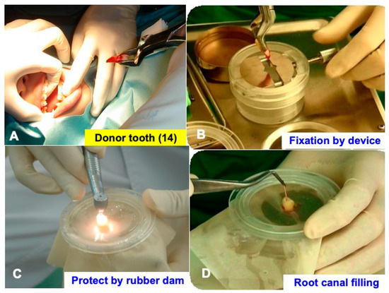 Immediate root canal filling in tooth-fixing device. (A) Extraction by forceps. Note: root covered with blood. (B) Setting with device. (C) Roots and periodontal ligament cells protected by rubber dam during treatments. (D) Immediate root canal filling (RCF).