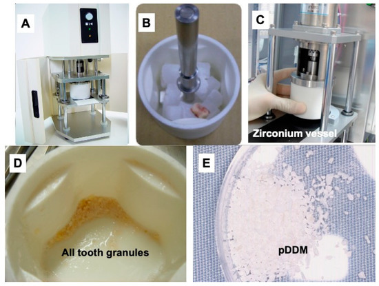 Preparation of partially demineralized dentin/cementum matrix (pDDM) using a mill. (A) View of entire mill. (B) Tooth on 0.9% saline ice blocks (1 × 1 × 1 cm3) in ZrO2 vessel. (C) Setting on stage. (D) All tooth granules crashed using ZrO2 blade in a ZrO2 vessel. (E) pDDM in dish. ZrO2: Zirconium.
