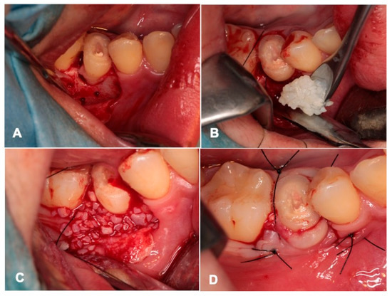 Surgical procedure. (A) Donor tooth (#14) after immediate RCF transplanted into cavity (#45). Note: unstable tooth and cortical perforations. (B) pDDM graft after tooth stabilization by bonding agent. (C) View of blood coagulation with pDDM. (D) Flap repositioned and sutured with nylon threads. Note: removal of a part of the crown.
