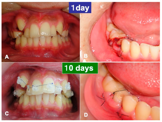 One day after the surgery, a blood clot was formed in the pocket around the transplanted tooth (Figure 5A,B). Gingival inflammation at the recipient site was slight, the orthodontic wire with brackets was set in the maxillary teeth, and the orthodontic treatment started at 7 days (Figure 5C). The gum healed normally at 10 days, and the threads were removed (Figure 5D). The grafted pDDM granules were not exposed and were received by the periodontal tissues. At 4 weeks, the tooth fixation was removed, and occlusal contact was created using composite resin. The orthodontic treatments continued for 2.5 years in the private dental clinic. The orthodontic movement and rotation were possible for the transplanted tooth, and a metallic sound was not heard at 1.5 years using a percussion test. At 2.5 years, the periodontal pocket was approximately 2 mm. During the entire follow-up period of 4.5 years, complications such as abnormal mobility did not occur.