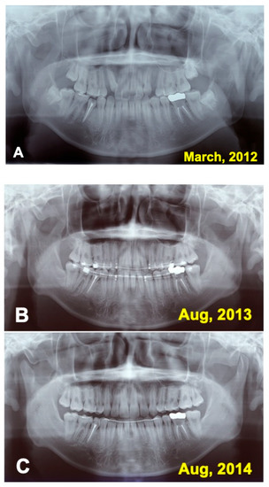 Panoramic X-ray photos. (A) Appearance just after surgery. (B) Appearance at 1.5 years during orthodontic treatment. Note: extraction of wisdom teeth (#38, #48). (C) Appearance at 2.5 years. Removal of orthodontic devices, except mandibular retention wire.