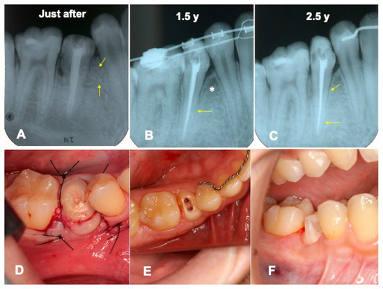 Dental X-ray and intraoral photos. (A) Appearance just after surgery. Arrows showing pDDM granules. (B) Appearance at 1.5 years. Arrow indicating suspected area after limited root resorption. Totally remodeled bone-like shadow (*). (C) Appearance at 2.5 years. Arrows indicating periodontal ligament space. (D) View just after immediate surgery. (E) View of root and periodontal tissues before being built up. (F) View just after core formation for impression of final ceramic crown. Abutment tooth built up with a direct resin composite core (BeautiCoreSystem®, Shofu Co., Ltd., Kyoto, Japan) with fiberpost (BeautiCoreFiberPost®, Shofu Co., Ltd., Kyoto, Japan).