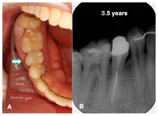 Final follow-up views in 2016. (A) X-ray photo showing continuous periodontal ligament space with lamina dura indicating non-ankylosis (#45). (B) View after removal of retention wire. Note: healthy gum line (#45).