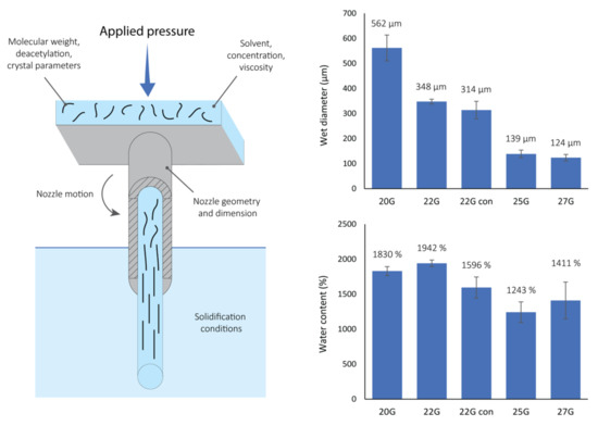 The chitin-based hydrogel fibers utilized in this study have been synthesized starting from a homogenous 1 wt./vol.% solution of α-chitin in HFIP. The synthesis was performed via a controlled extrusion at 75 kPa of the solution into a counter-solvent (Figure 1), in this case distilled water, that induced the precipitation of the biopolymer. A screening study of the nozzle internal diameter (NID) was performed to determine its influence in the resulting fiber diameter and molecular alignment in the chitin-based hydrogel fibers. Four steel cylindrical nozzles were tested: 20G (NID 0.81 mm), 22G (NID 0.64 mm), 25G (NID 0.455 mm), and 27G (NID 0.361 mm). In addition, a 22G plastic conical nozzle, 22G con, (NID 0.41 mm), was tested.