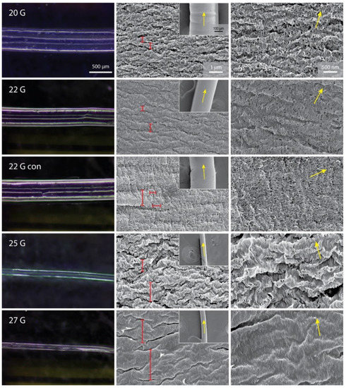 As previously mentioned, the SEM observation of the dried fibers showed a general increase in fibrillar alignment with smaller NID nozzles. This qualitative observation was confirmed from the image analyses performed. This analysis showed proportionally more intense and sharper bell distributions of fibril orientation when using thinner nozzles. This is coherent with a higher shear stress between the nozzle’s internal wall and the solution during the extrusion process. Thus, this stress would consequently induce alignment in the solution prior to precipitation [39]. Coherently, the conical geometry produced a lower shear stress and induced almost no fibrillar alignment along the extrusion direction [40]. As mentioned, another feature observed with a strong correlation with the fibrillar alignment was the surface porosity and consequent exposed surface.