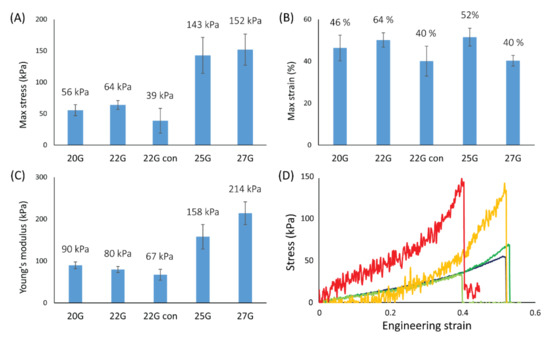 Results of the mechanical tensile tests on the wet fibers. Different mechanical parameters are reported for each of the printing conditions: (A) max stress; (B) max strain; (C) Young’s modulus. Number of samples per condition, N ≥ 6. For each condition the average value is reported above each histogram column. In (D) representative stress-strain profiles of the gel fibers studied are reported: 20G (blue), 22G (dark green), “22G con” (light green), 25G (yellow), and 27G (red).