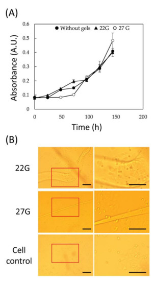 In order to evaluate the biocompatibility of the fibers, a cell culture was performed in presence of the fibers. In this experiment, two types of scaffolds were tested: 22G and 27G, using the same fiber length. The gels were introduced into each well and incubated for 144 h (6 days). Figure 4A shows the cell viability during the culture period. Regardless of the diameter of the gels, there was no clear difference from the culture in the absence of gel. In addition, at the bottom of the well after 144 h from the start of co-culture, it was confirmed that cells were growing around the gels with no difference in density compared to elsewhere in the well (Figure 4B).