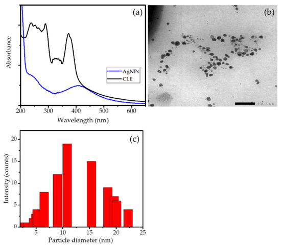 (a). UV-Visible spectra of CLE and AgNPs (b). TEM image of synthesized AgNPs (c) Particle size distribution of AgNPs.