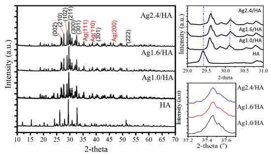 The XRD patterns of Ag/HA samples are shown in Figure 2. The presence of the crystalline structure of HA is identified by the planes of (002), (210), (211), (112), (300), (310), (222), and (213); refer to the JCPDS card no. 09–432 [27,28]. Reflections are still maintained in Ag/HA samples other than the existence of Ag reflections presented at around 37.5, 39.0, and 47.4°, which are associated with planes (111), (110), and (200) (refer to JCPDS No: 84–7103), respectively. From the compared (211) plane of HA, a shifted reflection to a higher angle due to the Ag doping is found, which indicates the replacement of Ca ions with Ag ions [29,30]. Moreover, the shift is not significant due to the increasing Ag content. In addition, using the Scherer calculation for the (111) plane of Ag, the crystallite size of Ag is not appreciably different, valued at about 87.7–88.9 nm.