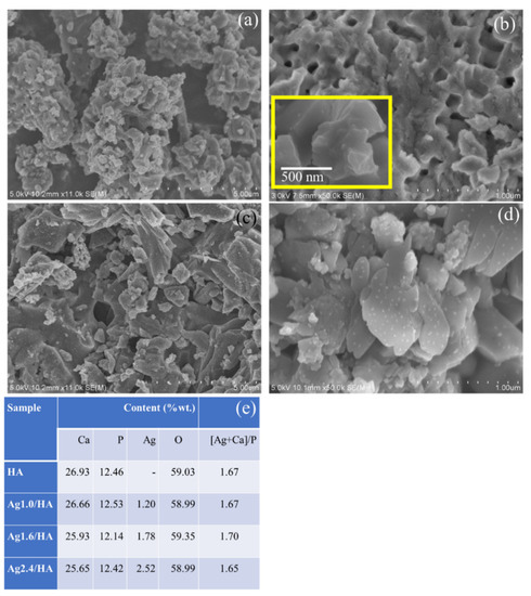 Figure 3 shows the surface morphology of HA and Ag/HA samples. A distributed AgNPs identified by white dots is exhibited by Ag/HA samples, which was also confirmed by the elemental analysis from XRD analyses presented in Figure 3e. It was also found that the Ag contents in the nanocomposite are relatively matched with what was set up, and so are the Ca/P ratios at around 1.65–1.70. The more detailed morphology revealed the porous structure of HA, which is maintained by the modification. The more detailed analysis of the doped Ag was performed by TEM analysis, with the images presented in Figure 4.
