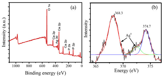 However, XPS analysis of the samples exhibits a single species of Ag0 in the structure, as confirmed by the Ag 3d spectrum presented in Figure 5. The survey scan in Figure 5a reveals some peaks associated with the existence of Ca, P, and O atoms as the main components of HA [33]. The calculation of the intensity ratio of the Ca/P peaks shows 1.667, which is within the ratio obtained by EDX analysis and meets the theoretical ratio in HA (1.67). In addition, the Ag 3d spectrum shows double peaks at 368.3 and 374.7 eV associated with 3d5/2 and 3d3/2, respectively. These peaks correspond to unperturbed metallic silver, as expected for Ag in nanoparticle form [34].