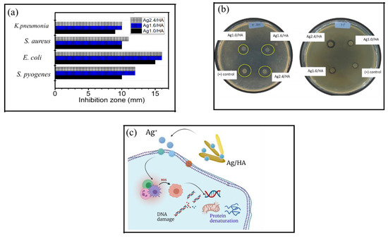 (a). Recapitulated inhibition zone of Ag/HA (b). Images from antibacterial test (c). Schematic representation of antibacterial activity of Ag/HA.