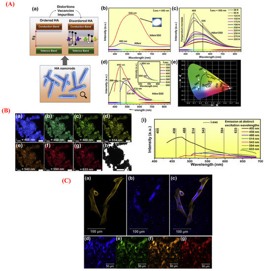 (A) The optical behavior of HAp nanorods (HApnr): (a) the general model for self-activated fluorescence in the nano-sized particles, in which the energy levels in the forbidden zone are minimized while the presence of defects and the elimination of impurities lead to a higher disorder in the HAp structure, allowing radiative recombination of e’–h• pairs at defect energy levels between the valence band (VB) and conduction band (CB); (b) the emission spectra of HApnr and HApnr350 samples by laser excitation at λexc = 350 nm; (c) the temperature-dependent photoluminescence of HApnr350 sample by laser excitation at λexc = 350 nm; (d) the excitation dependence of the HApnr350 sample probed by the spectrofluorometer at room temperature; and (e) the Commission Internationale de l’Éclairage (CIE) chromaticity diagram. (B) The optical response of the HAnr350 species obtained by confocal microscopy, monitored by exciting at λexc = 405, 458, 488, 514, 543, 594, and 633 nm (a, b, c, d, e, f, and g, respectively): (h) the bright-field micrograph of the power analyzed; scale bar = 200 mm and (i) the corresponding emission spectra obtained by exciting at distinct wavelengths. (C) The confocal imaging of human dermal fibroblast (HDFn) cells incubated with the HAnr350 sample (320 mg/mL) for 48 h: (a) the cytoskeleton labeled with Alexa Fluor 532 Phalloidin (λexc = 514 nm); (b) the fluorescence image exhibiting blue fluorescent HAp NPs (λexc = 405 nm); and (c) merged images. (d–g) The multiple excitation/emission imaging of intracellular the HAnr350 NPs (λexc = 405, 488, 543, and 594 nm, respectively). Reproduced with permission from ref [89].