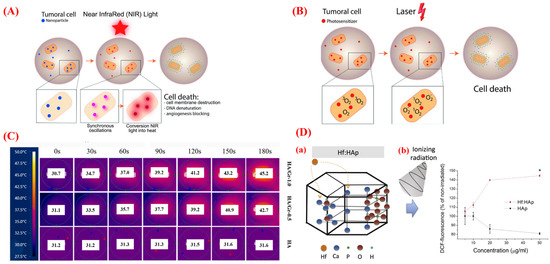 (A) Photothermal therapy (PTT) mechanism. (B) Photodynamic therapy (PDT) mechanism. (C) The effect of NIR on increasing the temperature of HAp/gelatin/graphene scaffold and the role of increasing the concentration of graphene on increasing the temperature in PTT. (D) (a) The structure of the doped HAp-NPs with Hf for potential use in PDT; (b) the ROS generation of HAp-Hf in the non-irradiated and gamma rays (5 Gy) conditions. The DCF-fluorescence intensity significantly increased in the irradiated samples doped with Hf. Reproduced with permission from refs [50,142,144].