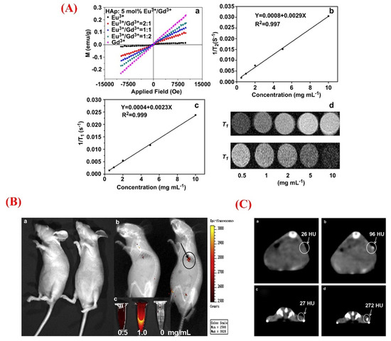 Generally, two main approaches are being applied to improve the luminescence intensity of doped HAp nanostructures. An increase in dopant content in the HAp structure is proposed as the first method; however, this may lead to fluorescence quenching and greater cytotoxicity. The second strategy is related to calcination at high temperatures to increase the luminescence intensity by improving the HAp particle crystallinity as well as enhancing the diffusion of dopants into the HAp crystalline lattice. However, calcination may increase the size and agglomeration of HAp crystals, interfering with cellular uptake. As an alternative approach, co-doping of HAp NPs has been investigated to improve luminescence intensity. For example, HAp nanocrystals were co-doped with Eu3+ (2 mol%) and Gd3+ (0.5, 1, 1.5, 2 mol%) ions for boosting luminescence properties, making them suitable as imaging agents in vitro and in vivo [90]. The main reason behind this elevated luminescence property (up to about 120%) was attributed to the energy transfer from Gd3+ to Eu3+ (6PJ of Gd3+→ 5HJ of Eu3+) under 273 nm and the possible combined effect of the cooperative up-conversion and the successive energy transfer under 394 nm (Figure 5A). The synthesized samples showed good biocompatibility and hemocompatibility with a blood circulation time of at least 3 h after vein injection into BALB/c-nu mice. In an intracellular acidic environment, the Eu/Gd co-doped HAp nanocrystals exhibited suitable biodegradability (about 65% after 72 h). Intraperitoneal and tail vein injection of the Eu/Gd co-doped HAp nanocrystals caused a fluorescent signal in BALB/c-nu mice; the HAp nanocrystals accumulated mainly in the liver (about 160 ± 37 nmol/g) due to reticuloendothelial system (RES) uptake (Figure 5B). Regarding the active surface of HAp and the possibility of its easy modification by tumor-targeting ligands, the authors concluded that Eu/Gd co-doped HAp nanocrystals might actually have a tumor-targeting function.
