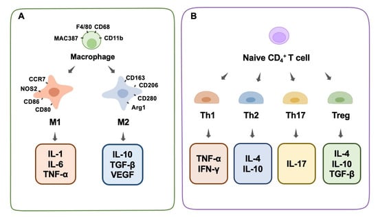 Macrophage phenotype and T-cell differentiation. (A) Macrophage phenotype, surface antibodies, and secreted cytokines. (B) T-cell differentiation and secreted cytokines.