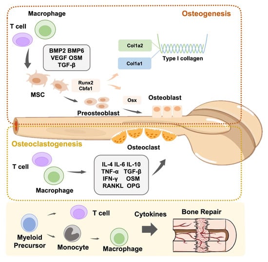 Schematic representation of the role of immune cells in bone modeling and remodeling. Immune cells are actively involved in osteoclastogenesis and osteogenesis.