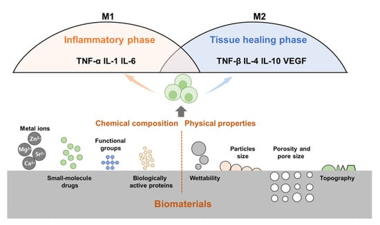The physicochemical properties of bone biomaterials influence the immune response. For example, wettability, topography, particle size, porosity and pore size, release of metal ions, small molecule drugs, active proteins, and surface functional groups can modulate immune cells (e.g., macrophages) and their immune responses.