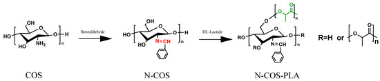 N-COS and lactide were added to a small amount of dry DMSO solution at room temperature according to different molar mass ratios (1:10, 1:20, 1:40, 1:60, 1:100). The catalyst stannous octoate with a mass fraction of 0.1% was added. Before addition, N2 was replaced several times; the reaction temperature was 140 °C, and the reaction time was 8 h. After the reaction, the product was cooled to room temperature and then precipitated by adding anhydrous ethanol. The product was obtained by centrifugation. After vacuum drying at 45 °C for 24 h, different proportions of N-COS-PLA were obtained. The reaction synthesis route is shown in Figure 1 [20].