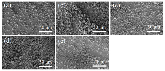 SEM images of N-COS-PLA drug-loaded microspheres. (a–e) Different proportions of COS:PLA: 1:10, 1:20, 1:40, 1:60, 1:100.