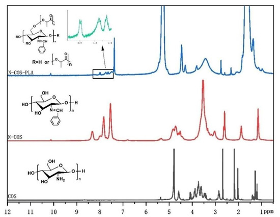 The 1 HNMR results of COS, N-COS, and N-COS-PLA are presented in Figure 3. In the COS 1HNMR spectrum, the peak at 1.98 ppm was attributed to -CH3 in the N-alkylated glucosamine residue, and singlet H peak for N-acetyl glucosamine was observed at 2.98 ppm; there was a multistate peak at 3.45–4.12 ppm, which was due to the chemical shift of -CH- on the sugar ring and proton hydrogen at 6C. The peak at 4.58 ppm was attributed to H of glucosamine [30]. In addition to the chemical shift of H in COS, the absorption peak of the benzene ring and the chemical shift of -HC=N appeared at 7.73–8.33 ppm and 10.12 ppm, respectively. In the 1HNMR analysis of N-COS-PLA, the absorption peaks at 1.67 ppm and 5.27 ppm were the characteristic peaks of CH3 and -CH- in the PLA structure, respectively. The 1HNMR results show that N-COS and N-COS-PLA are successfully synthesized. With an increase in the molecular weight of the polymer, the characteristic peaks -CH3 and -CH- in the structure of PLA in the polymer increased, and the absorption peak intensity of N-COS-PLA at 1.67 ppm and 5.27 ppm increased.