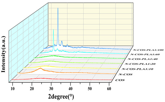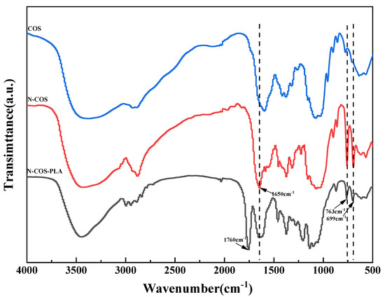 COS, N-COS, and N-COS-PLA were recorded by a Fourier transform infrared spectrometer (NicoltAvatar 360 Beijing, China). Fourier transform infrared spectroscopy was performed at room temperature in the frequency range of 4000–4500 cm−1. The scanning number was 100 times, and the resolution was 4 cm−1. The infrared spectrum of the powder was obtained with a KBr sheet [23].