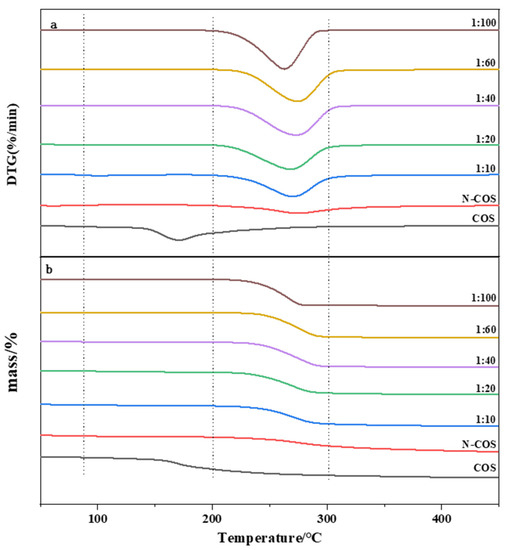 Thermal performance curves of COS, N-COS, and N-COS-PLA. (a) DTG curves of COS, N-COS, and N-COS-PLA with different weight ratios (g/g). (b) TG curves of COS, N-COS, and N-COS-PLA with different weight ratios (g/g).