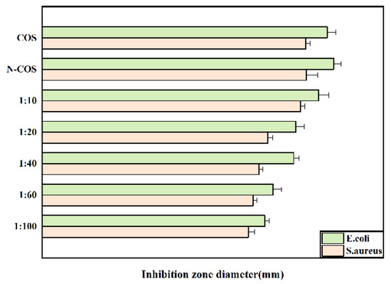 The inhibition zone diameters of Escherichia coli and Staphylococcus aureus treated with COS, N-COS, and different proportions of N-COS-PLA are presented in Figure 7. As shown in the figure, the inhibition zone decreases with decreasing Schiff base chitosan content after the derivatives are treated with the two bacteria; under the same conditions, the antibacterial circle of derivatives against Escherichia coli is larger than that against Staphylococcus aureus. Therefore, the antibacterial activity of the derivatives against the two bacteria increased with the increase in the C=N group, and the antibacterial activity against Escherichia coli was better than that against Staphylococcus aureus.