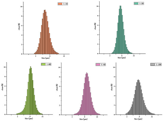 Figure 8 presents the particle-size distribution of drug-loaded microspheres with different materials. As shown in the figure, the average particle-size distribution of the 1:10 microspheres is 4.30 ± 0.12 µm; the average particle-size distribution of the 1:20 microspheres is 5.36 ± 0.09 µm, the average particle-size distribution of 1:40 microspheres is 9.88 ± 0.11 µm; the average particle-size distribution of the 1:60 microspheres is 8.11 ± 0.06 µm, and the average particle-size distribution of the 1:100 microspheres is 7.01 ± 0.16 µm. It can be observed from the particle-size distributions that the molecular weight of the microsphere-sized polymer increases. This occurs because with a decrease in the PLA ratio, the amount of hydroxyl in the copolymer is greater, which is not conducive to the formation of long chains. The shorter the copolymer molecular chain, the smaller the core–shell diameter and the particle size of the microspheres.