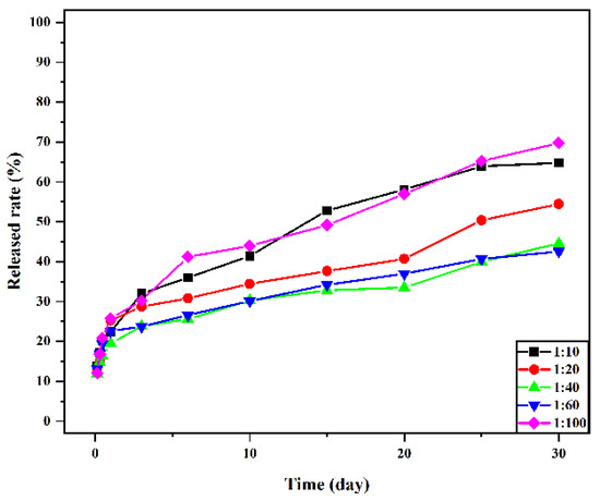 The drug-release rate was positively correlated with the molecular weight distribution, morphology, drug loading, and encapsulation efficiency of the material [37]. Figure 9 presents the in vitro release curve of drug-loaded microspheres with different material ratios. The figure shows that the release of vancomycin is sustained and stable, and the drug-loaded microspheres have no sudden release within 24 h of drug release. The release amount reached more than 20%, and most of the drugs in the microspheres were dissolved. After 30 days of release, the release amounts of 1:10, 1:20, 1:40, 1:60, and 1:100 drug-loaded microspheres were 64.80 ± 0.29%, 54.43 ± 0.54%, 44.60 ± 0.43%, 42.53 ± 0.40%, and 69.73 ± 0.45%, respectively, and the release amount of 1:100 was the highest. There is no sudden release effect in the release process, which is a very advantageous feature for drug delivery systems. It is conducive to the sustained and stable release of the drug-loaded microspheres in vivo within a certain time range and to prolong the retention time of vancomycin in the human body and the retention time of the effective plasma concentration.