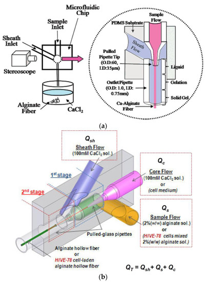 - Lee, K.H.; Shin, S.J.; Park, Y.; Lee, S.-H. Synthesis of Cell-Laden Alginate Hollow Fibers Using Microfluidic Chips and Microvascularized Tissue-Engineering Applications. Small 2009, 5, 1264–1268. [Google Scholar] [CrossRef]