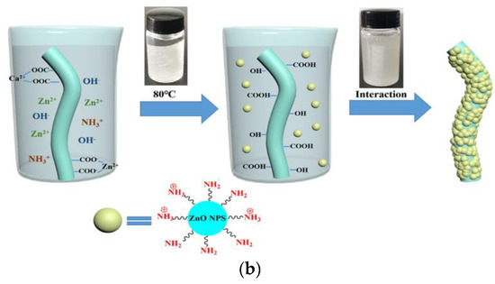 - Zhang, G.; Xiao, Y.; Yan, J.; Zhang, W. Fabrication of ZnO nanoparticle-coated calcium alginate nonwoven fabric by ion exchange method based on amino hyperbranched polymer. Mater. Lett. 2020, 270, 127624. [Google Scholar] [CrossRef]