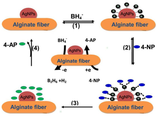 - Zhao, X.H.; Li, Q.; Ma, X.M.; Xiong, Z.; Quan, F.Y.; Xia, Y.Z. Alginate fibers embedded with silver nanoparticles as efficient catalysts for reduction of 4-nitrophenol. RSC Adv. 2015, 5, 49534–49540. [Google Scholar] [CrossRef]
