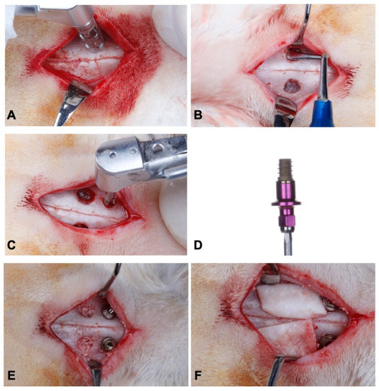 The study followed a split mouth design. Implants were installed in accordance to a previously described protocol [32,35]. General anesthesia was induced by the association of Ketamine Hydrochloride (Agener Uniao Ltd., Sao Paulo, SP, Brazil), Xylazine Hydrochloride (Rompum; Bayer SA, Sao Paulo, SP, Brazil), and acepromazine (Univet, São Paulo, Brazil), in doses of 35 mg/kg, 5 mg/kg, and 0.75 mg/kg, respectively, intramuscularly. A trichotomy was performed on the nasal dorsum, then local asepsis, using a 1% PVPI solution. Subsequently, local anesthesia with 2% lidocaine and 1:100,000 adrenaline was also administered. An incision in the skin along the midline of the nasal bone was made in order to expose the dorsal surface. Two circular windows, with a diameter of 5 mm, were prepared on both sides of the nasal bone using a trephine drill (S.I.N.—Implant System, Sao Paulo, Brazil), under abundant saline irrigation (Figure 1A). The sinus mucosa was carefully elevated, and the implant installation sites were prepared 3 mm anterior to the bone windows (Figure 1B).