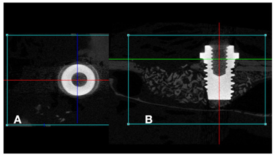 After 48 h of fixation in 10% buffered formaldehyde, the samples were scanned using the high resolution SkyScan 1172-160 micro-CT microtomograph (Bruker, Kontich, Antwerp, Belgium) to obtain two-dimensional tomographic projections and three-dimensional reconstruction. All scans were obtained at 100 kV and 100 μA, using an aluminum-copper filter to optimize the contrast, and set at 5.87 mm pixel size, 360° rotation, and a rotation step of 0.40. Two-dimensional tomographic projections and three-dimensional reconstruction were performed using the NRecon software (NRecon v.1.6.10.4, Bruker, Kontich, Antwerp, Belgium) and the implants were positioned on their long axis using the DataViewer software (v.1.5.0, Bruker, Kontich, Antwerp, Belgium), where it is possible to move and visualize the three axes (coronal, axial, and sagittal) (Figure 2). The axis of interest (sagittal) was selected for the complete visualization of the implants.