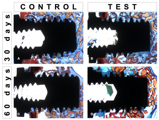 Each animal was considered as the statistical unit (n = 8). The significance level was set at 5% (p < 0.05). The distribution of histomorphometric and microtomographic data was verified by the Shapiro–Wilk test. The data presented a normal distribution, with Student’s t-test being selected for the analysis of differences between groups in each period of time (30 and 60 days), while for the analysis of intra-group differences between times (30 versus 60 days), the analysis of variance (ANOVA) with Tukey’s post hoc was used. The analyses were performed with SPSS software (IBM SPSS 23, IBM Corp., Armonk, NY, USA).
