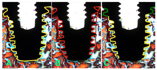 Surgical procedures—Histomorphometric Analysis: Illustrative diagram of the implant regions selected for BIC (A) and BAFO (B) measurements; (C) Cortical versus Grafted bone evaluation (green line—threads in contact with cortical bone/yellow line—threads in contact with grafted area).
