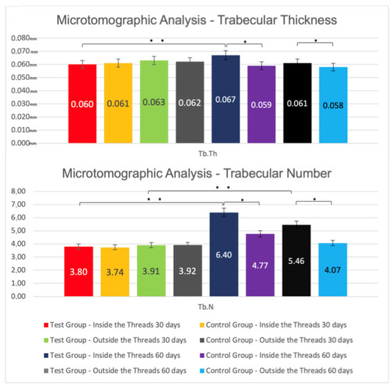 Mean values ± standard deviation of Trabecular Thickness (Tb.Th, mm) and Trabecular Number (Tb.N) at 30-day and 60-day microtomographic analysis. * Statistically significant difference in inter-groups comparisons (p < 0.05). ** Statistically significant difference in intra-groups comparisons (p < 0.05).