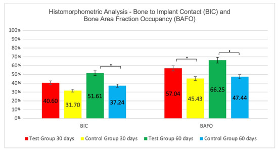 Mean values ± standard deviation percentages of Bone-to-Implant Contact (BIC) and Bone Area Fraction Occupancy (BAFO). * Statistically significant difference between groups (p < 0.05).