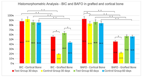 Mean values ± standard deviation percentages of Bone-to-Implant Contact (BIC) and Bone Area Fraction Occupancy (BAFO) in grafted bone and cortical bone—30 and 60 days. * Statistically significant difference inter-groups comparisons (p < 0.05). ** Statistically significant difference intra-groups comparisons (p < 0.05).