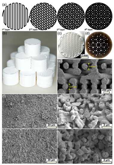 (a) The schematic portrayal of the printing pattern employed for the fabrication of the scaffolds, using a 45 degrees-rotation design. (b) Representative batch of as-fabricated scaffolds. (c,d) Optical photographs of a scaffold illuminated from (c) above and (d) below, demonstrating the projected macroporosity pattern. (e) General SEM image of a scaffold fractured along its height. (f–i) FE-SEM microstructure of the (f,g) BCP- and (h,i) BCP-6Sr2Mg-based scaffolds, evidenced on the (f,h) surface and (g,i) cross-section of the ceramic filaments.