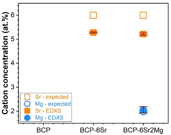 The concentration of the Mg and Sr cation substituents was inferred by EDXS, and the results were plotted in Figure 2 against the anticipated (intended) contents. If the ionic concentration of Mg was fairly reproduced (with only a ~3% relative increase being recorded), then for both the single- and double-doped CaP materials, a significantly larger deviation of Sr (i.e., a ~13% relative decrease with respect to the anticipated concentration) was revealed. These results agree with previous studies on cation-doped CaP-based bioceramics synthesized by wet-chemical routes, which evidenced a drop in the Sr incorporated concentration at contents equal to or in excess of 5% [76]. It is thus suggested that the solubility limit (threshold) of Sr in the lattice of CaPs was reached in the vicinity of this value, with the Sr excess being washed away in the filtration step.