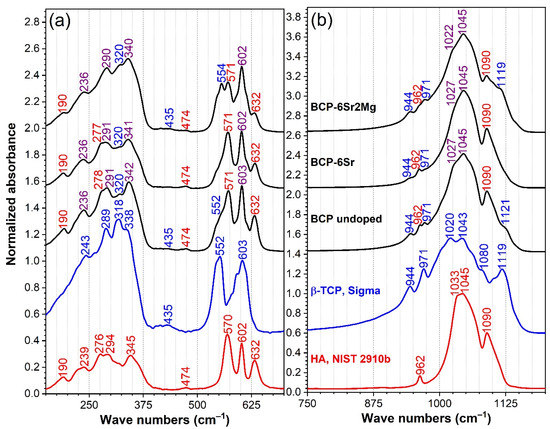 The comparative FTIR-ATR spectra of the BCP-based materials, presented in two relevant wave number regions: (a) 150–700 cm−1 and (b) 750–1200 cm−1. The spectra of two control samples, i.e., a hydroxyapatite NIST-SRM 2910b specimen (red curve) and a β-TCP Sigma-Aldrich (blue curve) pure commercial material (Sigma-Aldrich, product no. 49963), were inserted at the bottom of each graph frame for reader’s reference.